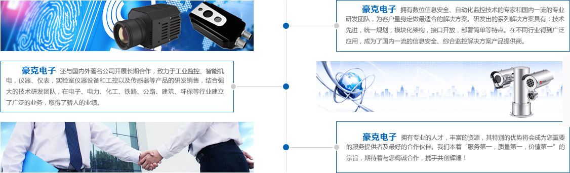西安豪克電子有限公司位于西安市高新技術產業開發區,成立于2000年7月。公司自成立以來,長期 致力于信息安全、自動控制等行業解決方案的研發生產,同時與國際知名公司進行廣泛合作,形成專業研發、生產、經銷一條龍服務,業務遍布全國上百個城市。
